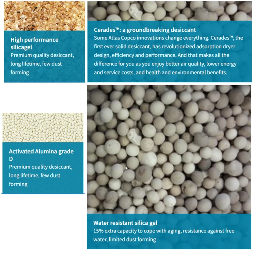 Gumantung ing titik embun tekanan, desiccants bisa digawe saka alumina, gel silika utawa bahan sieve molekuler. Titik embun tekanan minimal bisa tekan -70 ℃.
