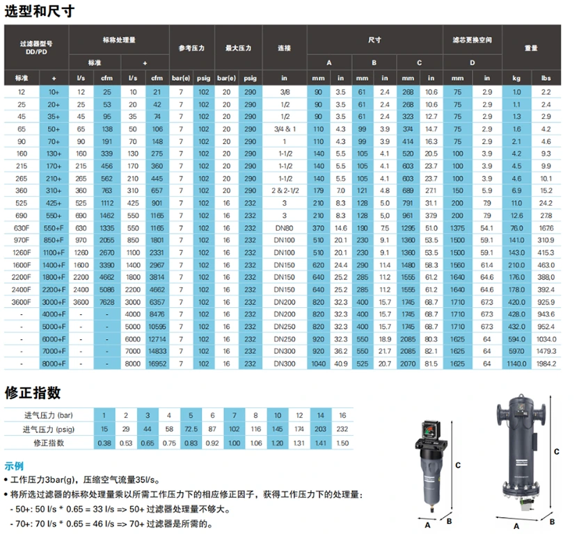Tabel iki nyedhiyakake informasi babagan saringan udara sing dikompres lan sawetara aplikasi khusus. |