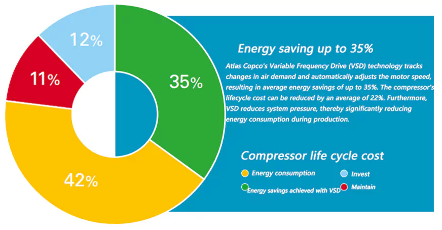 Konsumsi energi luwih saka 80% saka total biaya siklus urip Kompresor Udara Screw Bebas Minyak. Salajengipun, listrik ingkang dipunginakaken wonten ing produksi udara tekan menika langkung saking 40% saking total biaya listrik pabrik. Kanggo nyuda biaya energi, Atlas Copco ngrintis teknologi Variable Frequency Drive (VSD) ing industri udara kompres. VSD ora mung ngirit energi sing akeh nanging uga nglindhungi lingkungan kanggo generasi sabanjure. Thanks kanggo investasi terus-terusan ing teknologi iki, Atlas Copco bisa nawakake macem-macem kompresor VSD terintegrasi ing pasar.