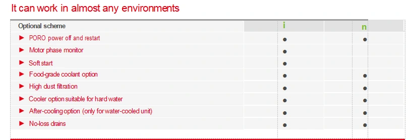 Kompresor kita nawakake coolant bahan pangan, filtrasi bledug dhuwur & cooler banyu atos lan opsi liyane sing diadaptasi kanggo lingkungan sing atos, sing bisa nyukupi kabutuhan aplikasi sampeyan.