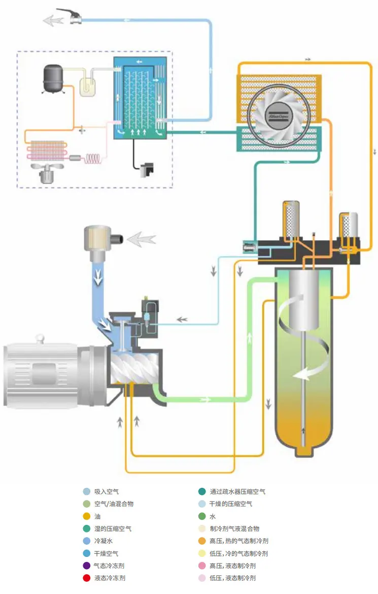 · Penggemar cooling independen, cooler efisiensi dhuwur, lan pengering sing dibangun kanthi tekanan titik embun 5 ℃ kanggo nyegah kondensat lan korosi pipa ing jaringan pipa.