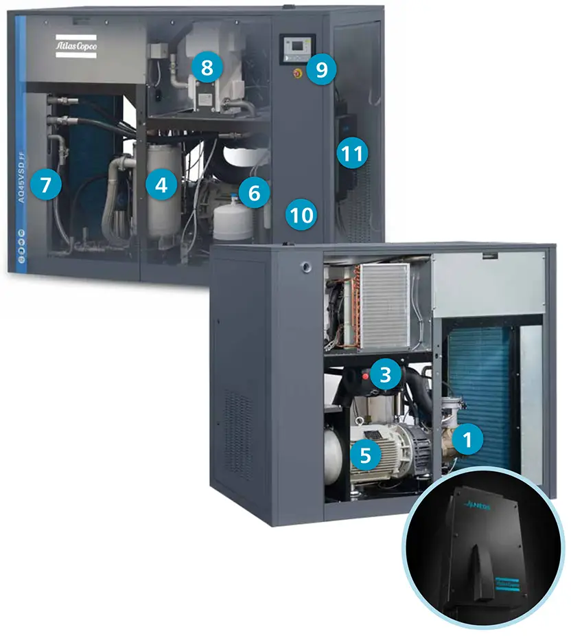 Teknologi AQ VSD Atlas Copco nglacak owah-owahan panggunaan gas pelanggan lan nyetel kecepatan kompresor ing wektu nyata, entuk tabungan energi rata-rata nganti 35 persen lan total tabungan biaya siklus urip kira-kira 22 persen.