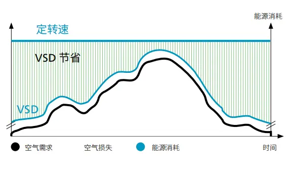 Konsumsi energi kompresor luwih saka 70% saka kabeh biaya siklus urip, lan produksi udara sing dikompress nganggo luwih saka 40% saka total tagihan listrik pabrik. sawetara saka kompresor udara variabel speed drive (VSD) ing pasar.
