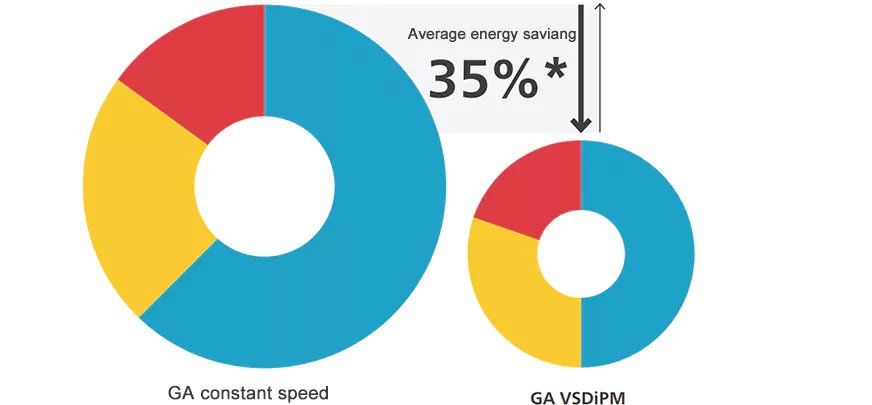 Seri VSDiPM Atlas Copco bisa kanthi otomatis nyetel kacepetan motor kanggo ngontrol lan nyukupi syarat panggunaan gas para pelanggan. Dibandhingake karo kompresor sing didorong kanthi kacepetan sing ditemtokake, Kompresor Udara Frekuensi Variabel VSD ngirit rata-rata nganti 35% energi.